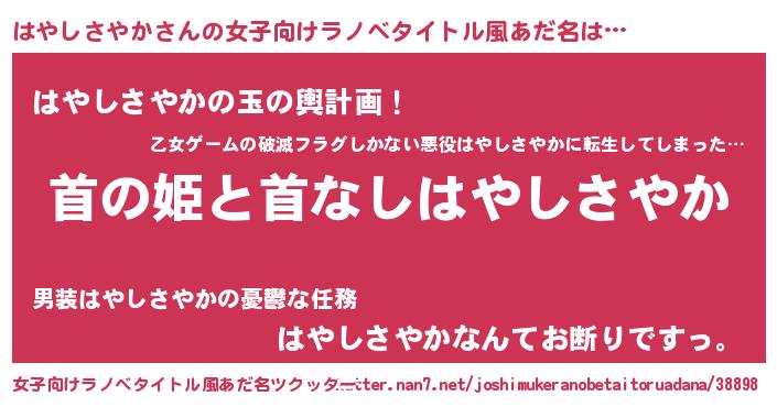 | 男性向けラノベタイトル風あだ名 | 『はたらくはやしさやかさま!』 |