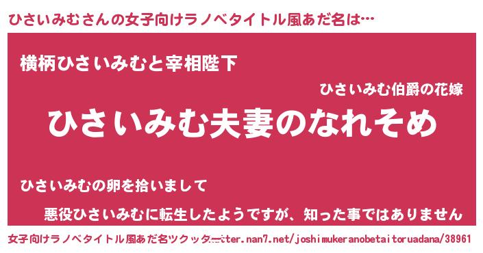 | 男性向けラノベタイトル風あだ名 | 『おまえをオタクにしてやるから、俺をひさいみむにしてくれ! 』 |