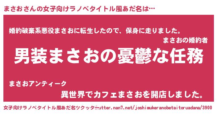 | 男性向けラノベタイトル風あだ名 | 『冴えないまさおの育てかた』 |