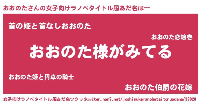 | 男性向けラノベタイトル風あだ名 | 『おおのたの嫁は女の子じゃないと思った?』 |