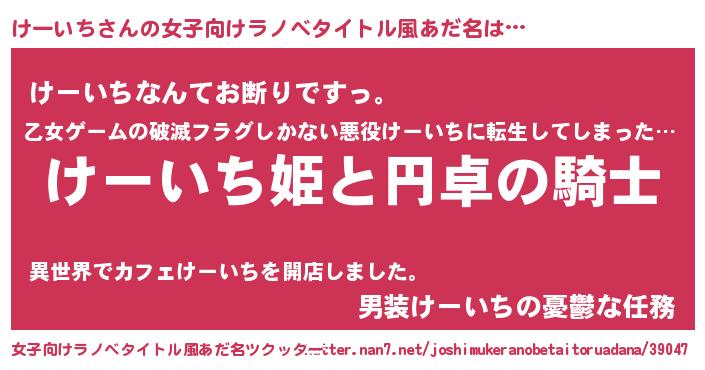 けーいちさんの女子向けラノベタイトル風あだ名は… 『けーいち姫と円卓の騎士』『けーいちなんてお断りですっ。』『男装けーいちの憂鬱な任務』 ツクッター #女子向けラノベタイトル風あだ名ツクッター http://tkutter.nan7.net/joshimukeranobetaitoruadana/39047/