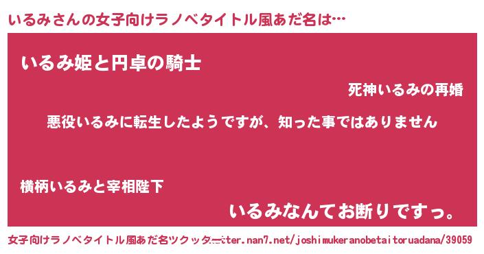 | 男性向けラノベタイトル風あだ名 | 『この素晴らしい世界にいるみを!』 |