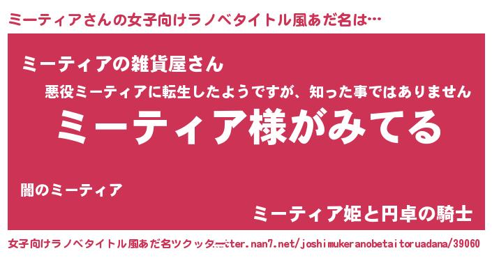 | 男性向けラノベタイトル風あだ名 | 『ミーティアの嫁は女の子じゃないと思った?』 |