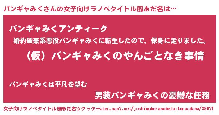 | 胡散臭い通販商品みたいなあだ名 | 『必ず成功する霊験あらたかなお札…その名も「バンギャみく」』 |