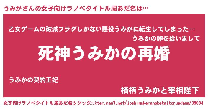 うみかさんの女子向けラノベタイトル風あだ名は… 『死神うみかの再婚』『乙女ゲームの破滅フラグしかない悪役うみかに転生してしまった…』『横柄うみかと宰相陛下』 ツクッター #女子向けラノベタイトル風あだ名ツクッター http://tkutter.nan7.net/joshimukeranobetaitoruadana/39094/