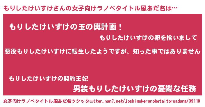 | 男性向けラノベタイトル風あだ名 | 『この素晴らしい世界にもりしたけいすけを!』 |