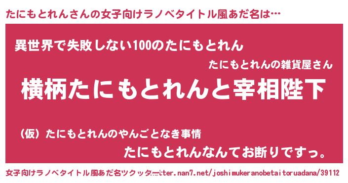 | 男性向けラノベタイトル風あだ名 | 『たにもとれんに滅ぼされるだけの簡単なお仕事です』 |