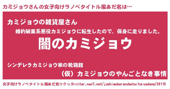 | 男性向けラノベタイトル風あだ名 | 『Re:カミジョウから始める異世界生活』 |