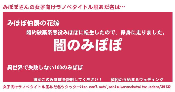 | 男性向けラノベタイトル風あだ名 | 『Re:みぽぽから始める異世界生活』 |