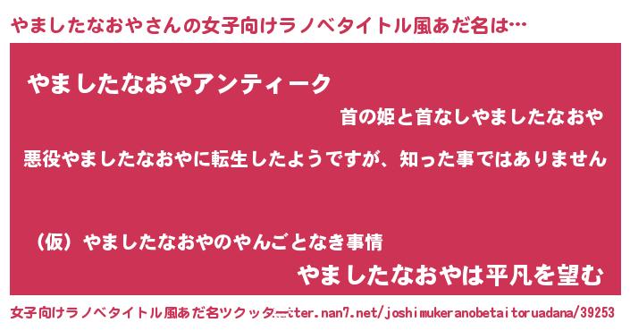 | 男性向けラノベタイトル風あだ名 | 『この素晴らしい世界にやましたなおやを!』 |