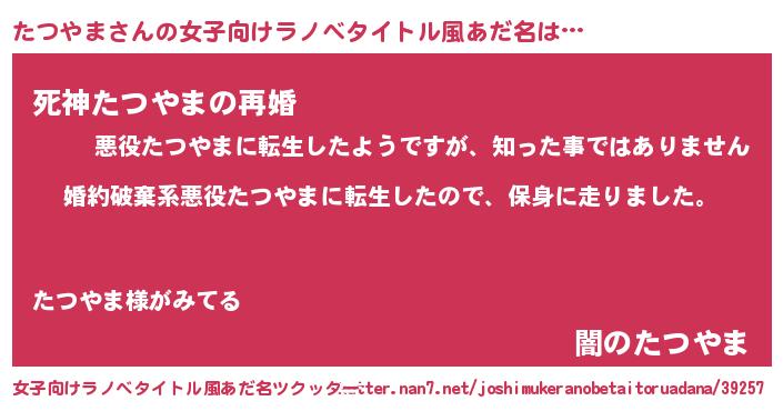 | 男性向けラノベタイトル風あだ名 | 『転生したらたつやまだった件』 |