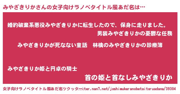 | 男性向けラノベタイトル風あだ名 | 『魔弾の王とみやざきりか』 |