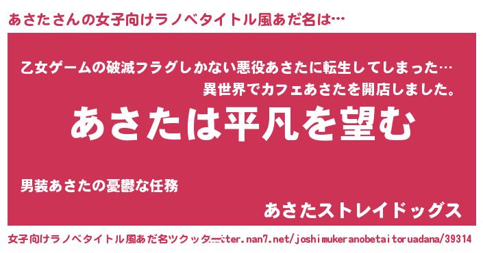 あさたさんの女子向けラノベタイトル風あだ名は… 『あさたは平凡を望む』『乙女ゲームの破滅フラグしかない悪役あさたに転生してしまった…』『あさたストレイドッグス』 ツクッター #女子向けラノベタイトル風あだ名ツクッター http://tkutter.nan7.net/joshimukeranobetaitoruadana/39314/