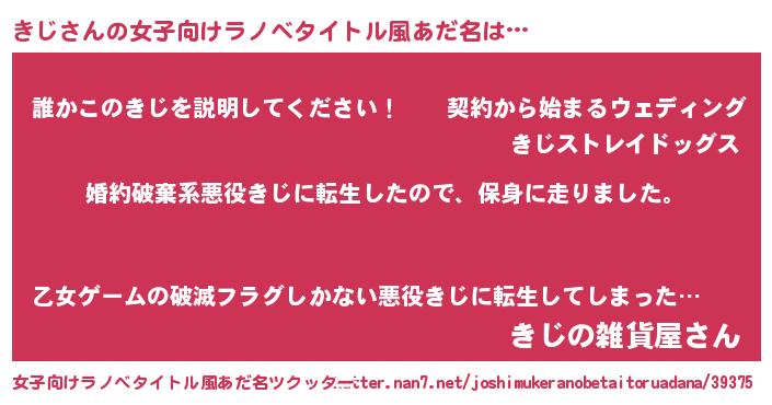 | 男性向けラノベタイトル風あだ名 | 『キジスレイヤー』『魔弾の王ときじ』 |