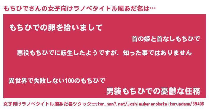 | 男性向けラノベタイトル風あだ名 | 『この素晴らしい世界にもちひでを!』 |