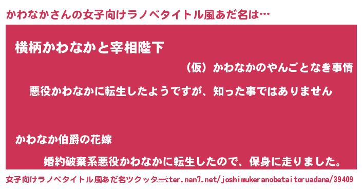| 男性向けラノベタイトル風あだ名 | 『この素晴らしい世界にかわなかを!』 |