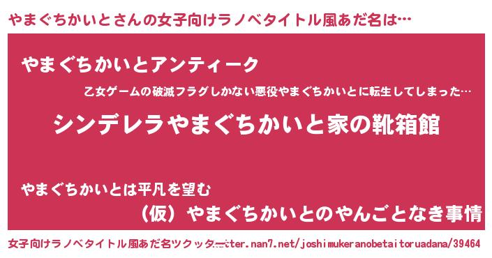やまぐちかいとさんの女子向けラノベタイトル風あだ名は… 『シンデレラやまぐちかいと家の靴箱館』『やまぐちかいとアンティーク』『(仮)やまぐちかいとのやんごとなき事情』 ツクッター #女子向けラノベタイトル風あだ名ツクッター http://tkutter.nan7.net/joshimukeranobetaitoruadana/39464/