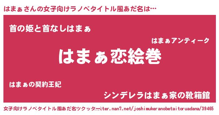 | 男性向けラノベタイトル風あだ名 | 『おまえをオタクにしてやるから、俺をはまぁにしてくれ! 』 |