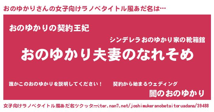 おのゆかりさんの女子向けラノベタイトル風あだ名は… 『おのゆかり夫妻のなれそめ』『おのゆかりの契約王妃』『闇のおのゆかり』 ツクッター #女子向けラノベタイトル風あだ名ツクッター http://tkutter.nan7.net/joshimukeranobetaitoruadana/39488/