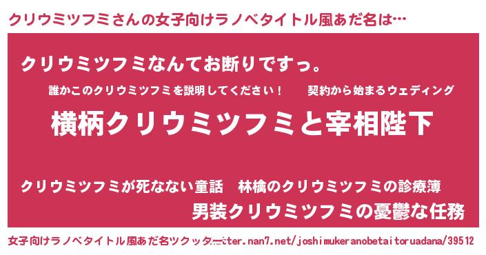 | 男性向けラノベタイトル風あだ名 | 『クリウミツフミに滅ぼされるだけの簡単なお仕事です』 |