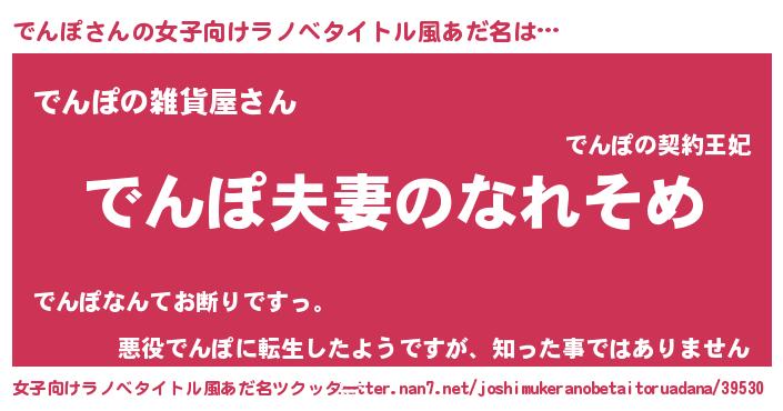 | 男性向けラノベタイトル風あだ名 | 『おまえをオタクにしてやるから、俺をでんぽにしてくれ! 』 |