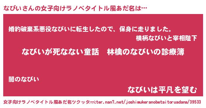 | 男性向けラノベタイトル風あだ名 | 『魔弾の王となびい』『ナビイスレイヤー』 |