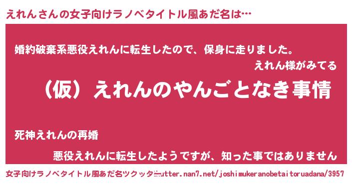 えれんさんの女子向けラノベタイトル風あだ名は… 『(仮)えれんのやんごとなき事情』『婚約破棄系悪役えれんに転生したので、保身に走りました。』『悪役えれんに転生したようですが、知った事ではありません』 ツクッター #女子向けラノベタイトル風あだ名ツクッター http://tkutter.nan7.net/joshimukeranobetaitoruadana/3957/