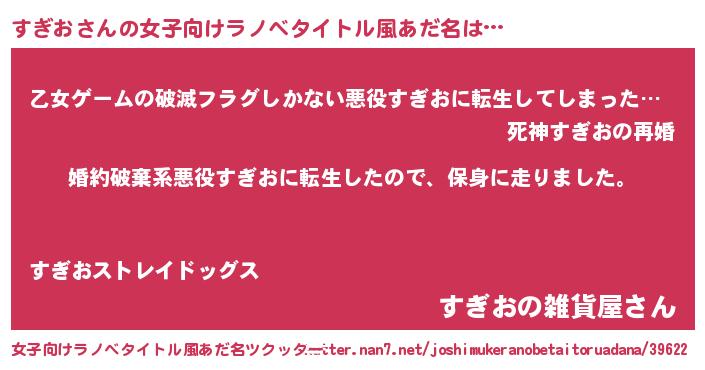 | 男性向けラノベタイトル風あだ名 | 『スギオスレイヤー』『魔弾の王とすぎお』 |