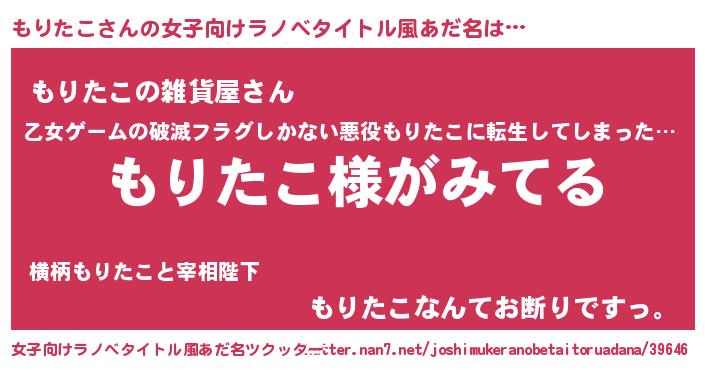 | 男性向けラノベタイトル風あだ名 | 『もりたこの嫁は女の子じゃないと思った?』 |