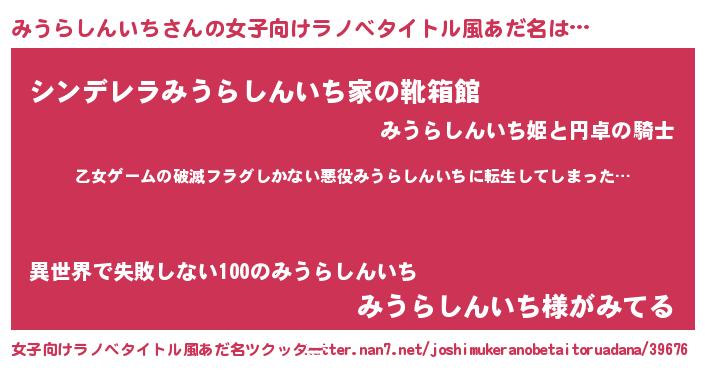 | 男性向けラノベタイトル風あだ名 | 『この素晴らしい世界にみうらしんいちを!』 |