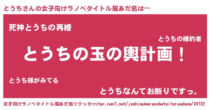 | 男性向けラノベタイトル風あだ名 | 『転生したらとうちだった件』 |