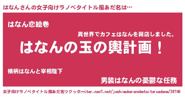 | 男性向けラノベタイトル風あだ名 | 『はなん~年齢イコール彼女いない歴の魔法使い~』 |