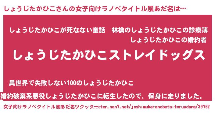 | 男性向けラノベタイトル風あだ名 | 『Re:しょうじたかひこから始める異世界生活』 |
