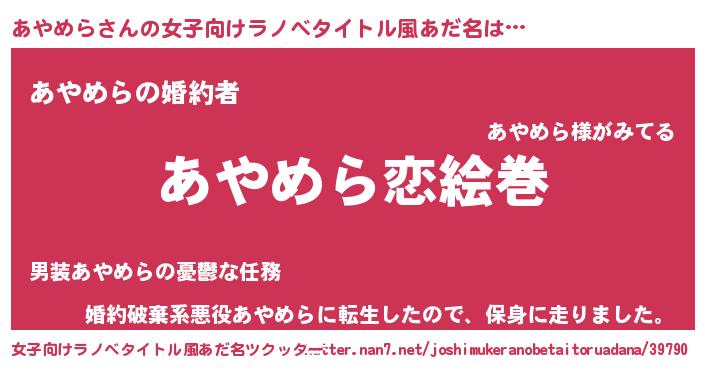 | 男性向けラノベタイトル風あだ名 | 『おまえをオタクにしてやるから、俺をあやめらにしてくれ! 』 |