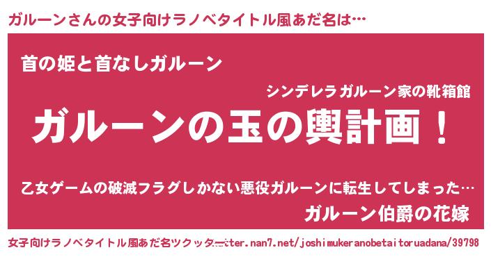| 男性向けラノベタイトル風あだ名 | 『ガルーン~年齢イコール彼女いない歴の魔法使い~』 |