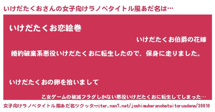 | 男性向けラノベタイトル風あだ名 | 『イケダタクオスレイヤー』 |