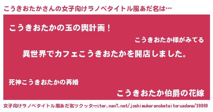 | 男性向けラノベタイトル風あだ名 | 『誰もが恐れるあのこうきおたかが、ぼくの専属メイドになるようです。』 |