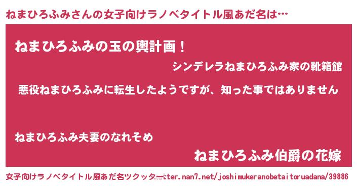 | 男性向けラノベタイトル風あだ名 | 『この素晴らしい世界にねまひろふみを!』 |