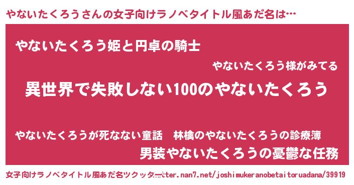やないたくろうさんの女子向けラノベタイトル風あだ名は… 『異世界で失敗しない100のやないたくろう』『やないたくろう姫と円卓の騎士』『男装やないたくろうの憂鬱な任務』 ツクッター #女子向けラノベタイトル風あだ名ツクッター http://tkutter.nan7.net/joshimukeranobetaitoruadana/39919/