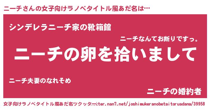 | 男性向けラノベタイトル風あだ名 | 『ニーチの嫁は女の子じゃないと思った?』 |
