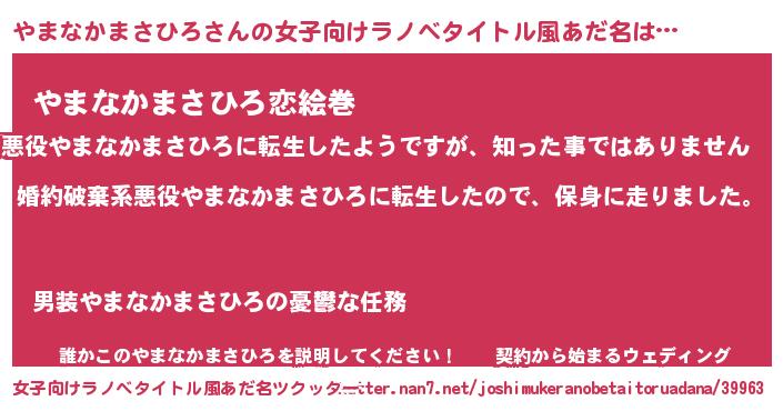 やまなかまさひろさんの女子向けラノベタイトル風あだ名は… 『婚約破棄系悪役やまなかまさひろに転生したので、保身に走りました。』『やまなかまさひろ恋絵巻』『誰かこのやまなかまさひろを説明してください! ~契約から始まるウェディング~』 ツクッター #女子向けラノベタイトル風あだ名ツクッター http://tkutter.nan7.net/joshimukeranobetaitoruadana/39963/