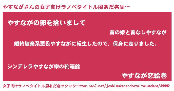 やすながさんの女子向けラノベタイトル風あだ名は… 『婚約破棄系悪役やすながに転生したので、保身に走りました。』『やすながの卵を拾いまして』『やすなが恋絵巻』 ツクッター #女子向けラノベタイトル風あだ名ツクッター http://tkutter.nan7.net/joshimukeranobetaitoruadana/39992/