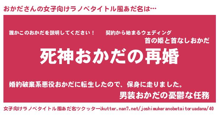 | 男性向けラノベタイトル風あだ名 | 『ノーゲーム・ノーオカダ』 |