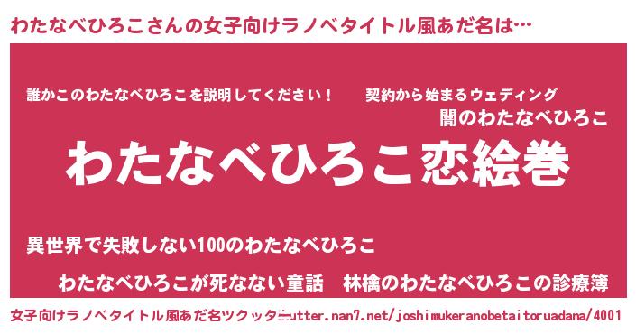 | 男性向けラノベタイトル風あだ名 | 『おまえをオタクにしてやるから、俺をわたなべひろこにしてくれ! 』 |