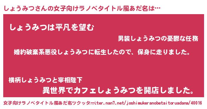 | 男性向けラノベタイトル風あだ名 | 『転生したらしょうみつだった件』 |