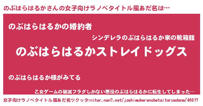 | 男性向けラノベタイトル風あだ名 | 『Re:のぶはらはるかから始める異世界生活』 |