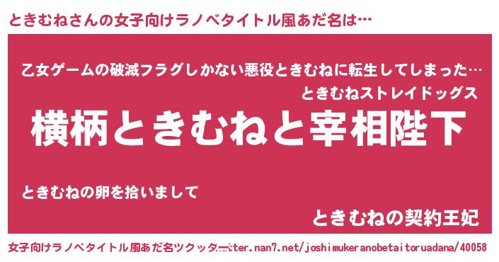 | 男性向けラノベタイトル風あだ名 | 『ときむねに滅ぼされるだけの簡単なお仕事です』 |