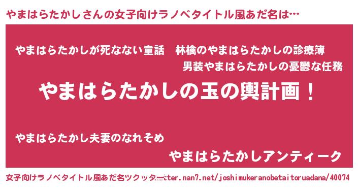 | 男性向けラノベタイトル風あだ名 | 『やまはらたかし~年齢イコール彼女いない歴の魔法使い~』 |