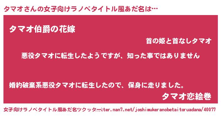 | 男性向けラノベタイトル風あだ名 | 『この素晴らしい世界にタマオを!』 |