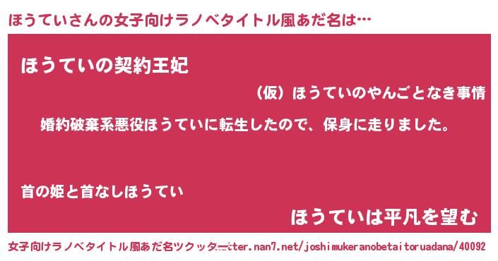 | 男性向けラノベタイトル風あだ名 | 『ホウテイスレイヤー』『ほうていの憂鬱』 |